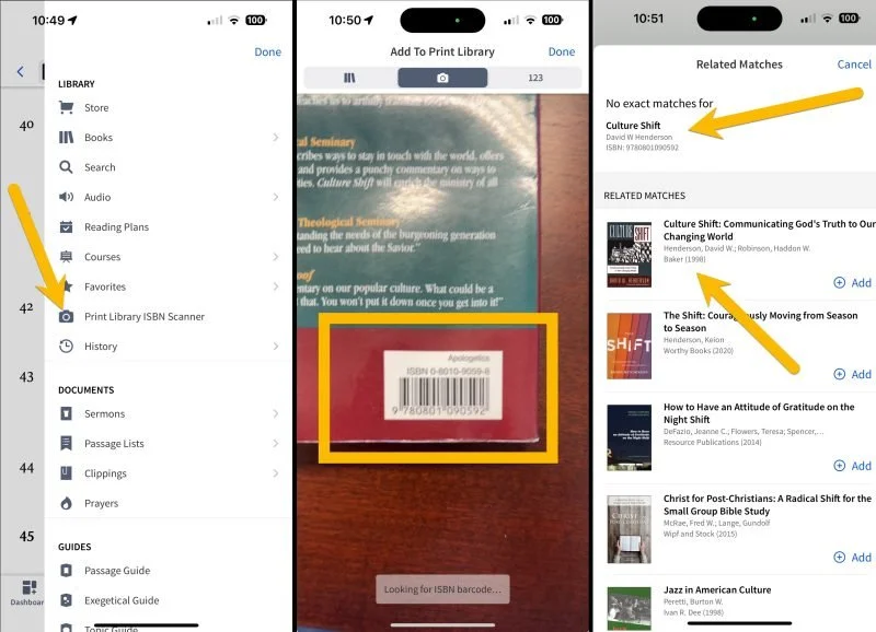 Print Library ISBN Scanner—Logos will let you scan your physical library books and show you search results from those books in your library if they offer them as Logos books. You can see where the search hit shows up in your book. You can take it off the shelf and read it or buy it from Logos. We learned about this new feature in our article on what's new in Logos Mobile 10. (See Below)