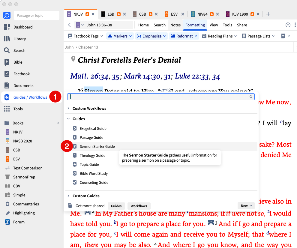 You'll find it under Guides/Workflows on the toolbar. Click on Sermon Starter Guide. This opens the guide to the passage in your open Bible. You can type in your text and run the guide, a helpful tool in sermon prep with Logos.