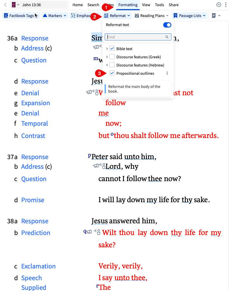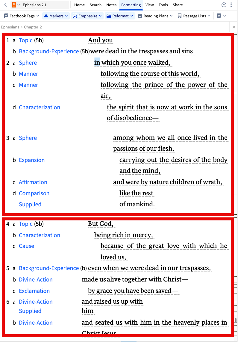 Logos includes something called Propositional Outlines. Look under the Formatting tab in your Bible. Select Reformat and then check Propositional Outlines from the list. Your Bible text will now look like the screenshot below. Look how this helps simplify your sermon prep.