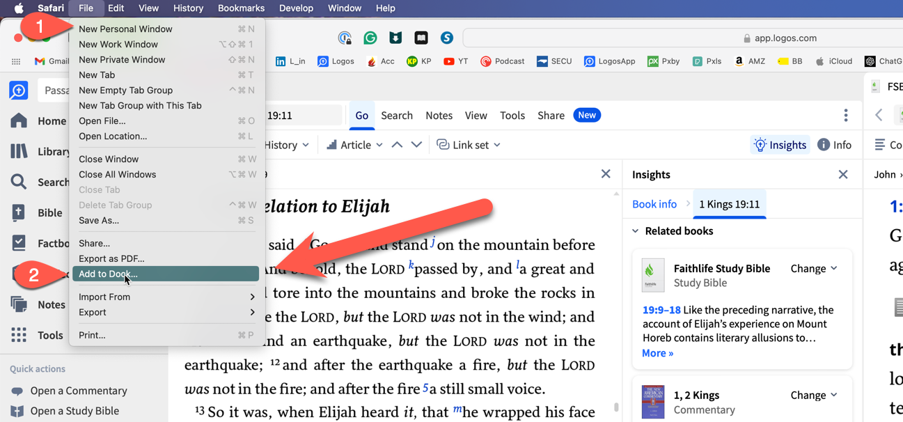 Go to the Logos Web App page. You'll find it at app.logos.com. You can also try out the beta version by using the address beta.app.logos.com. Click on the File menu in Safari and choose Add to Dock towards the bottom of the menu. This adds the icon on the right below to your Dock.