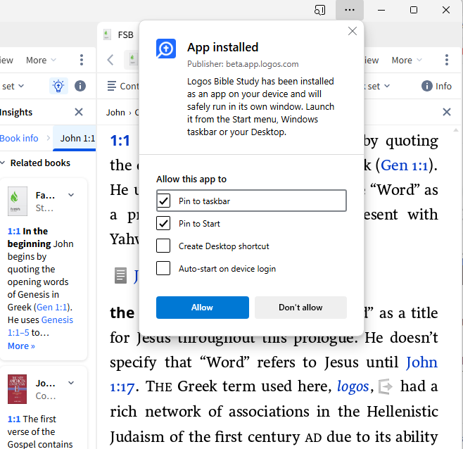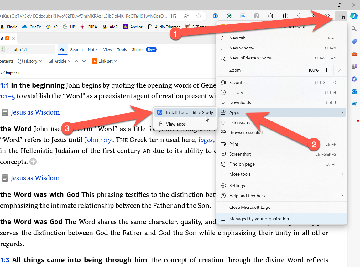 Click the menu icon (it looks like three horizontal dots at the right end of the Edge toolbar. Choose Apps and Install Logos Bible Study to install the Logos Web App as an app using Edge.