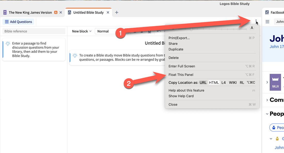 Now, maybe you want a third window pane, but you want it on the external monitor. Open a book or tool. In my example, I will open a Bible Study Builder (part of the new Logos as of October 2024). Float this window using either the Float this Panel menu item (#2 above) from the menu (three vertical dots in the upper right corner) or the keyboard shortcut COMMAND+OPTION+F.