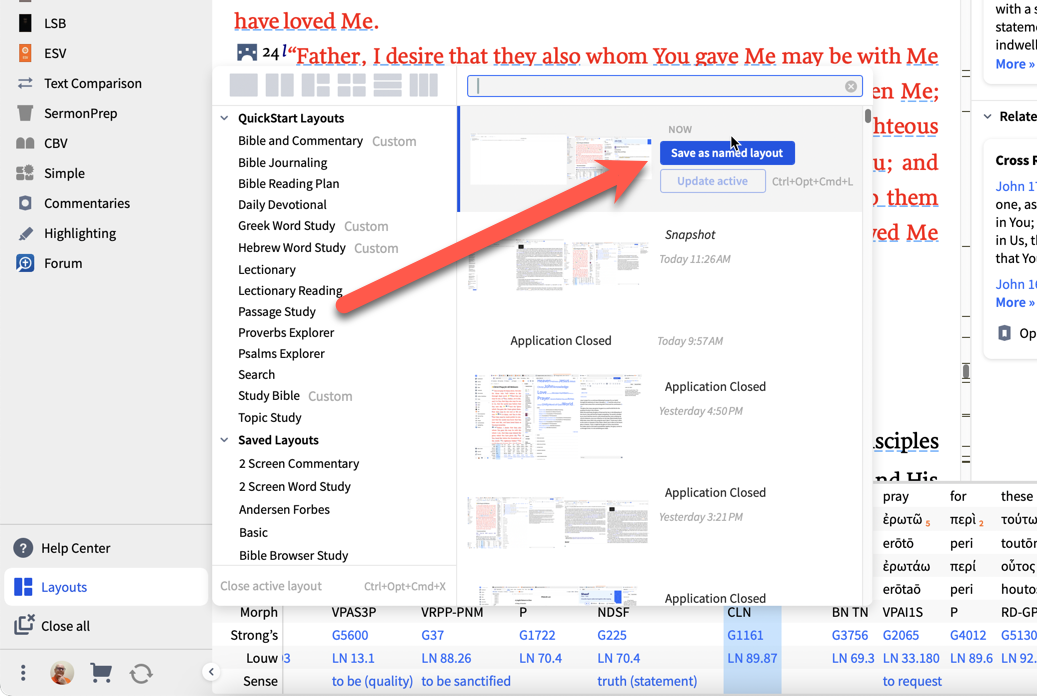 Now, let's save this layout so we can return to it quickly. Click on the Layout button on the toolbar in Logos (lower left corner or upper right corner, depending on where you place your toolbar in Logos).