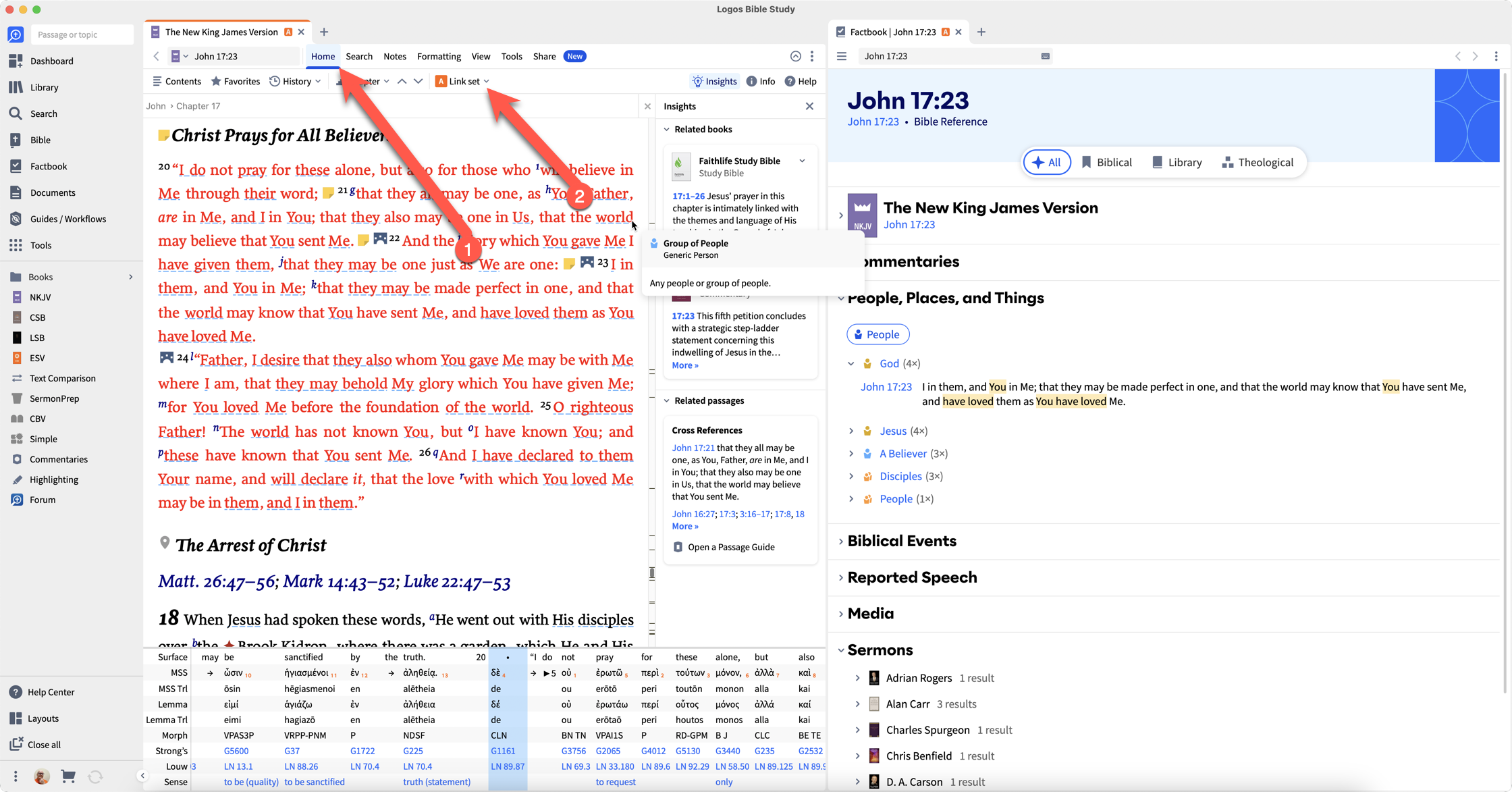The last step in using Logos on two monitors happens inside Logos itself. Open Logos and arrange the windows you want the way you want them. For example, I started things off by opening the NKJV and the Factbook and linked them together using Link Set A. To do this, click the Home tab (#1 below) and then the Link Set drop-down (#2 below). If you don't have a Logos subscription, your toolbar will look different than the screenshot below.