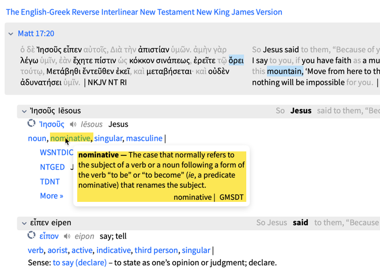 Hover over a blue hyperlink in the WORD BY WORD section of the Exegetical Guide. It shows a popup of the abbreviated info the link will show you when you click it.