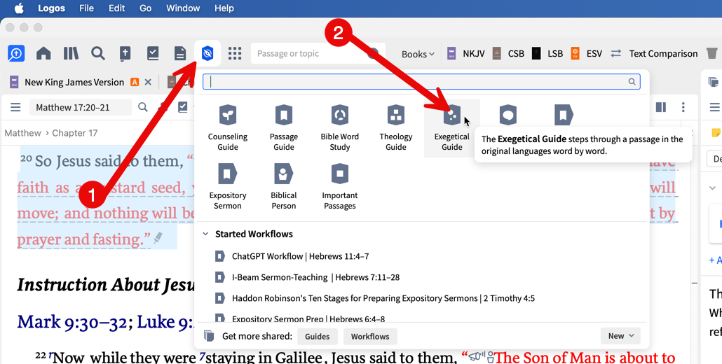 To open the Exegetical Guide, use either the right-click menu or the Guides button on the toolbar when selecting your passage. See the screenshot below.