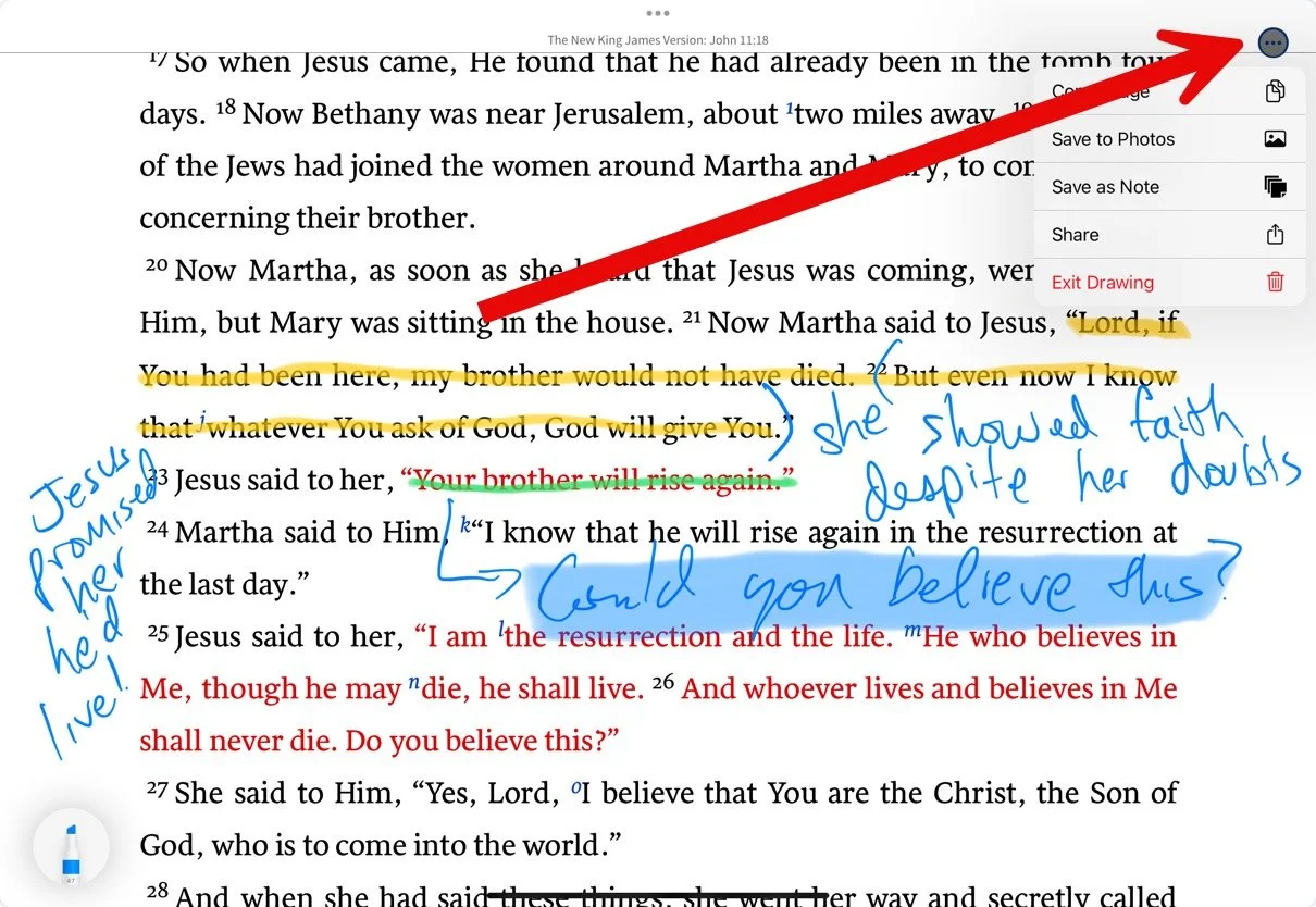 First, saving a Draw On Screen image in a note should be automatic or at least easier than it is. Add the option to the menu found when you tap on the icon in the upper right corner of the screen (three horizontal dots). That would offer the best option, or they could use the Share Sheet function in iOS to create a new note in Logos.