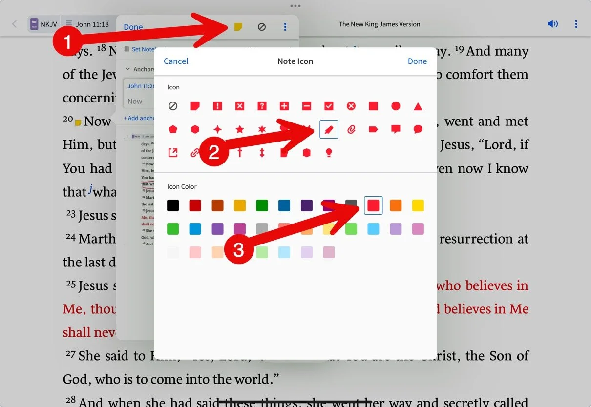 You can immediately see that a note includes a Draw On Screen image. Change the note icon to something unique. I use a Red Pen icon. On your iPad, change the icon by tapping on the Note Icon in the Note pop-up box. In that box, you can choose a different color and shape for the Note icon. Tap Done to exit the dialog box.